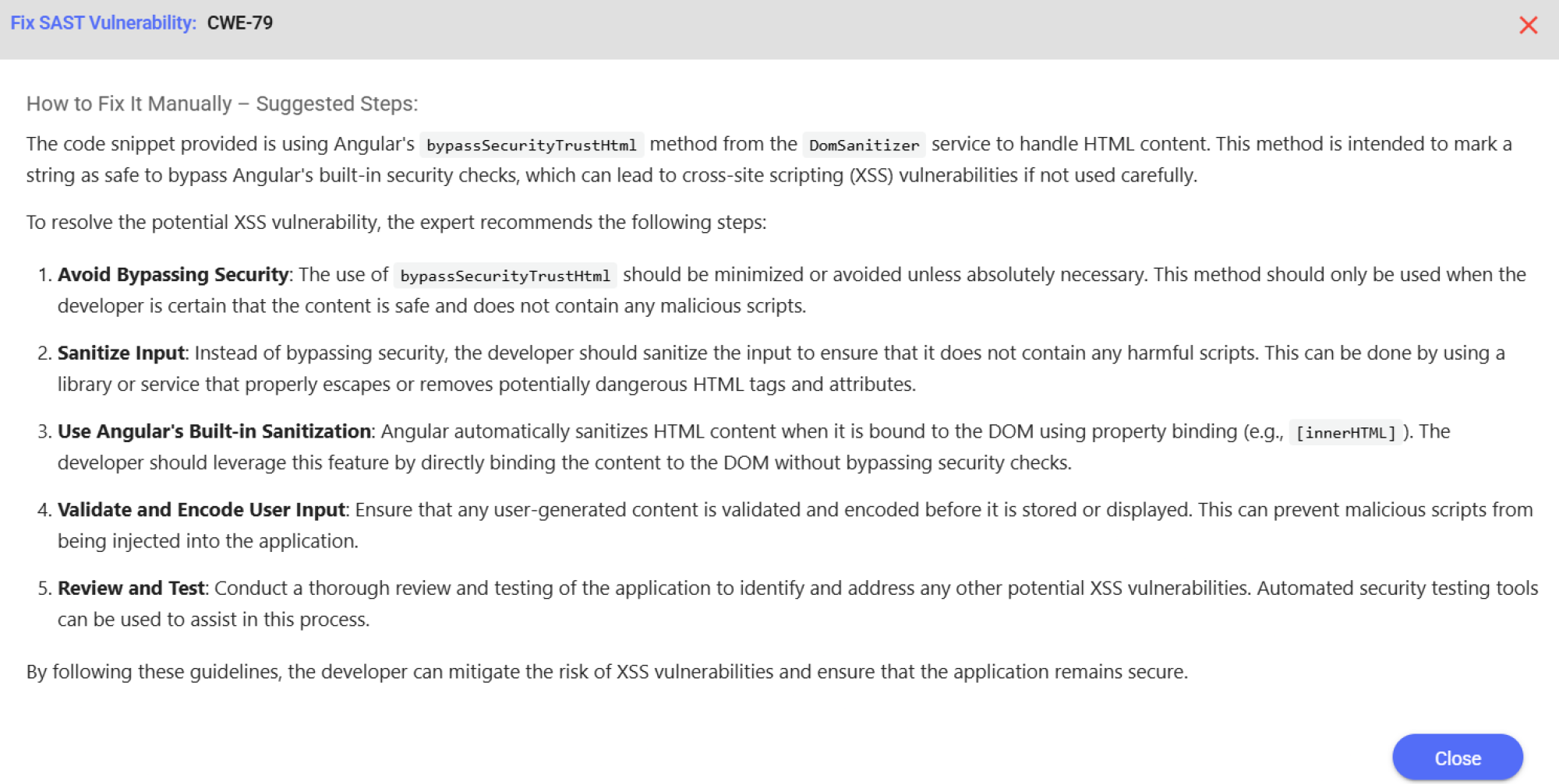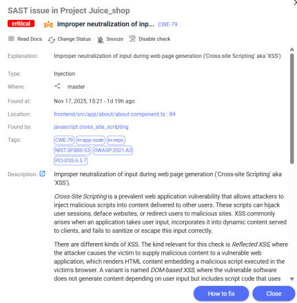 Безопасность исходного кода (SAST): раннее выявление рискованного и уязвимого кода с нулевым уровнем ложных срабатываний и автоматическим исправлением через ИИ.